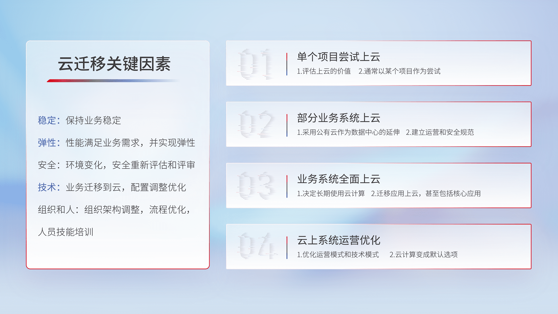 结合实际业务,,,从规划设计、、、、云平台选型、、、、云原生改造、、数据迁移、、、集成交付,,,迁移全过程为客户识别最佳上云路径,,,,做好风险识别管理,,设计网络架构、、、身份权限、、安全审计合规、、、操作审计、、、、日志审计、、、监控告警策略、、多站点容灾设计等,,,对云上基础设施进行整体规划,,,提升IT治理水平,,,以满足弹性、、高可用、、、高性能的需求。。。。