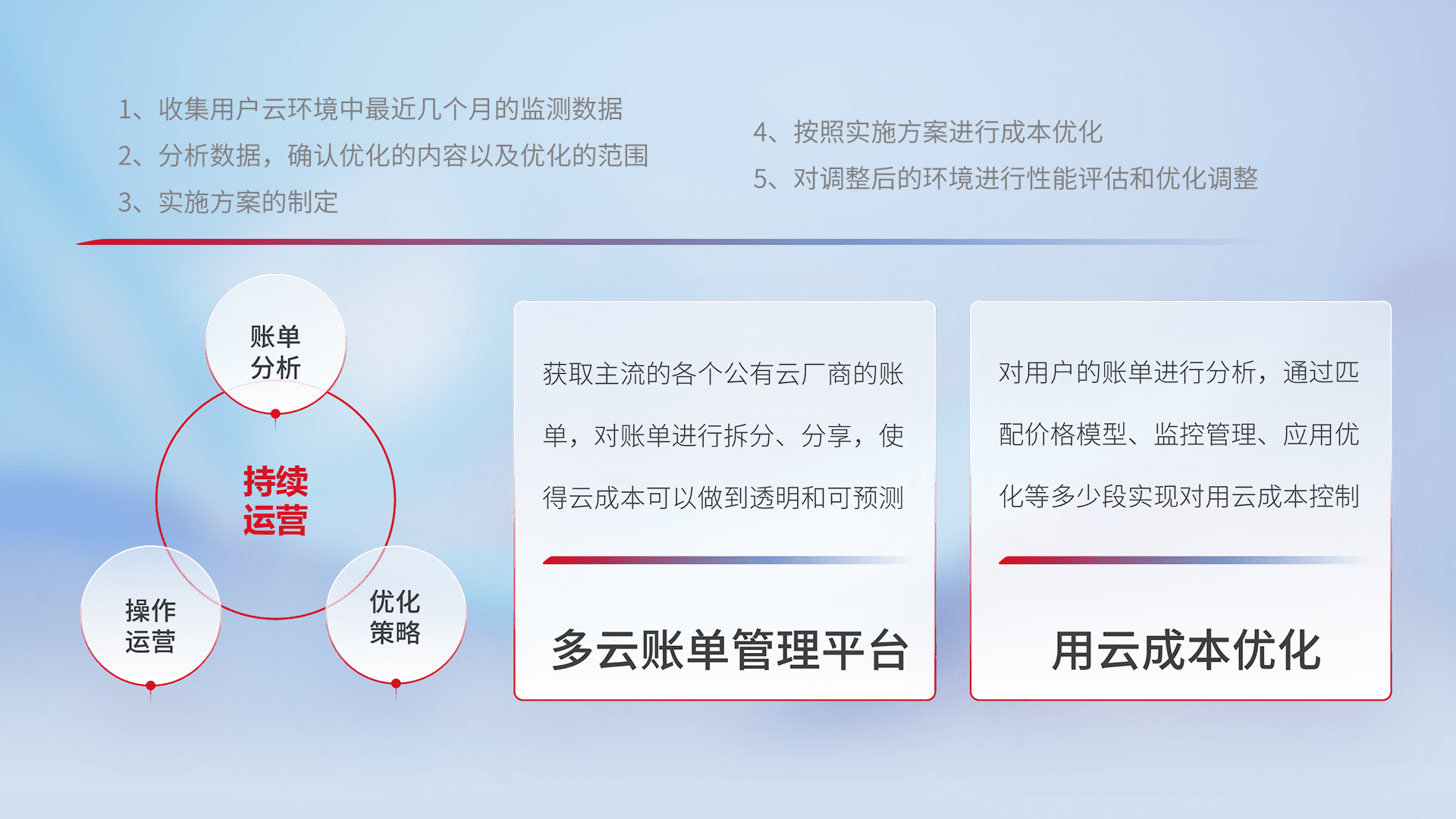 通过多云纳管,,,,以统一的资源数据模型把客户的云资源进行抽象和封装,,进而实现对多云资源的统一操作,,,,保障云资源管理的可靠性、、、稳定性与可用性。。量身定制化运维内容,,,,配置、、、开发运维、、、补丁管理、、、备份、、监控、、、、认证和访问管理、、、审计和日常巡检等,,,保障在用云过程中的可靠度,,稳定度以及高可用率。。。。