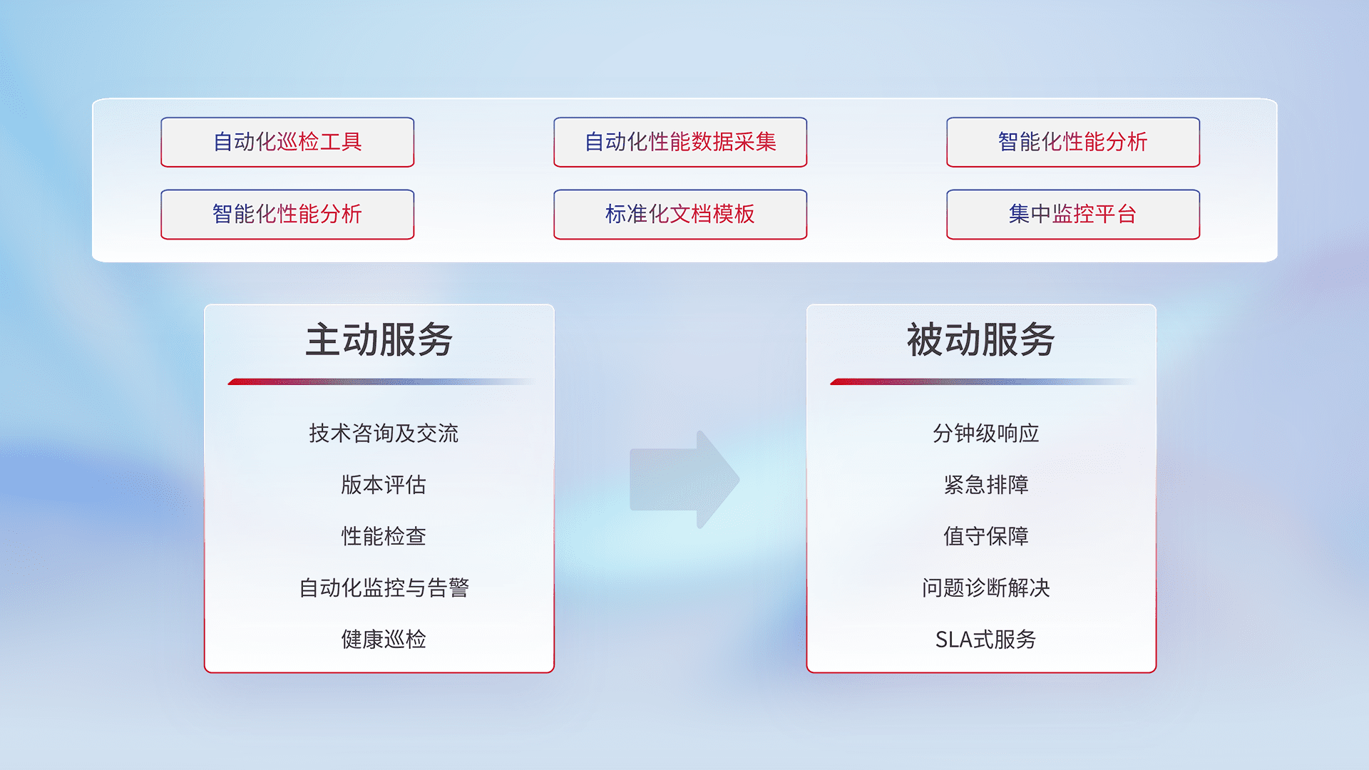 智能化工具和标准化文档,,,,保障服务质量,,,,提供主动服务(包含技术咨询、、版本评估、、、、性能检查、、、自动化监控与告警、、、健康巡检)和被动服务包含(分钟级响应、、、紧急排障、、、值守保障、、、、问题诊断解决、、SLA服务)。。
